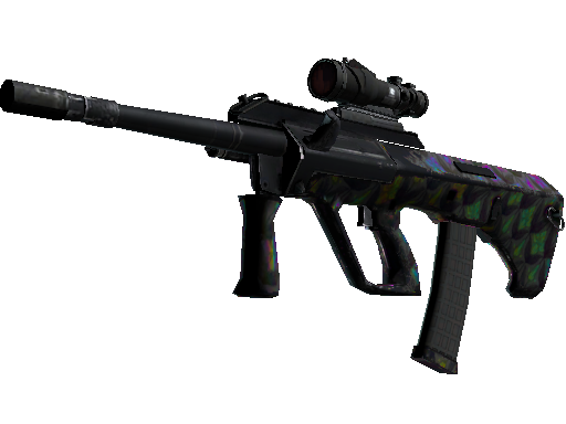 Powerful and accurate, the AUG scoped assault rifle compensates for its long reload times with low spread and a high rate of fire. A pattern of lilies has been applied using pearlescent, color changing paint.